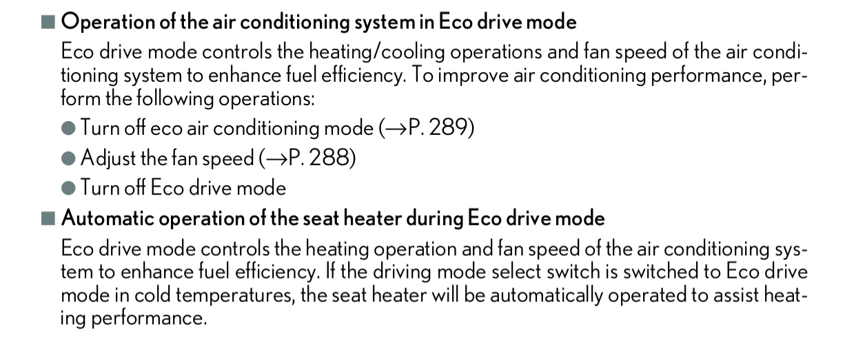 Ik neem aan dat jij de "conciërge" bedoelt, die heeft de mijne ook, afhankelijk van de temperatuur van de inzittenden past mijn auto de klimaatregeling aan, dit werkt met sensoren in de auto die mij en m'n passagiers in de gaten houden. Dit werkt heel subtiel en is geweldig bedacht door Lexus, 's ochtends gaat de stoel- en stuurverwarming netjes op standje "gebakken handen, rug en billen", na een tijdje wordt dat langzaam teruggeschroefd naar standje "warm houden" of zelfs helemaal uit. Als het warm is uiteraard net andersom (helaas heeft mijn auto geen stuurkoeling). Maar dit alles heeft niets met de ECO-stand te maken...Afhankelijk van het type Lexus kan het ook zijn dat de stoelverwarming (afhankelijk van de binnentemperatuur van de auto bij de start) al meteen helemaal uit zichzelf begint of op die manier kan worden ingesteld.