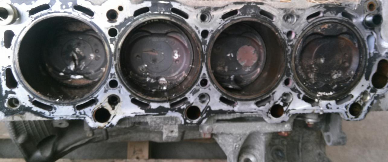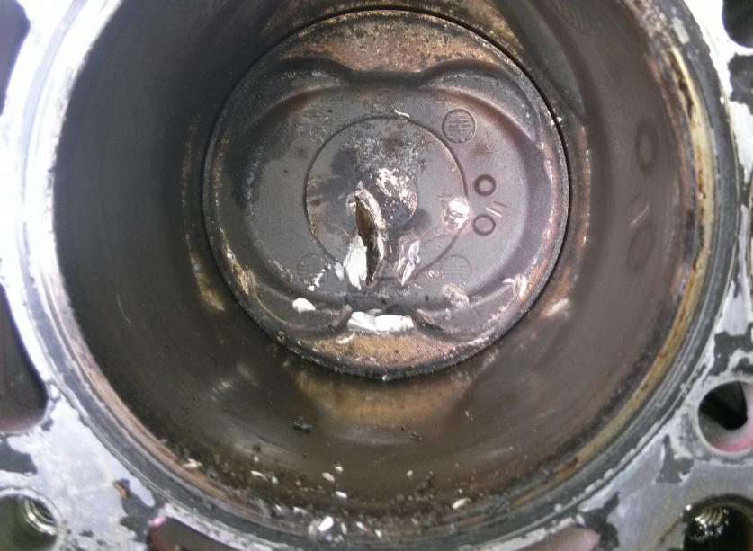 Om de directe oorzaak te bepalen, moet het blok open. Nu is alleen te zien dat de bougies platgeslagen/verbogen zijn, en de motor is ook niet te tornen.