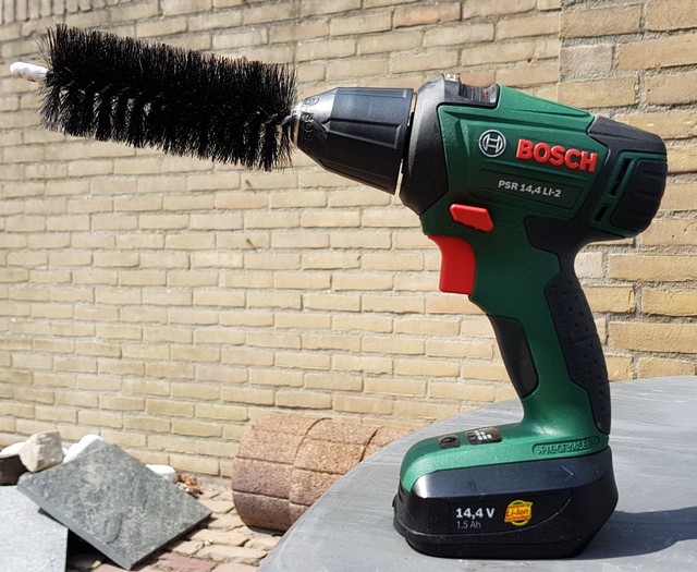 Een zachte radiatorborstel inkorten op ca. 15 cm en in een accuboormachine doen.