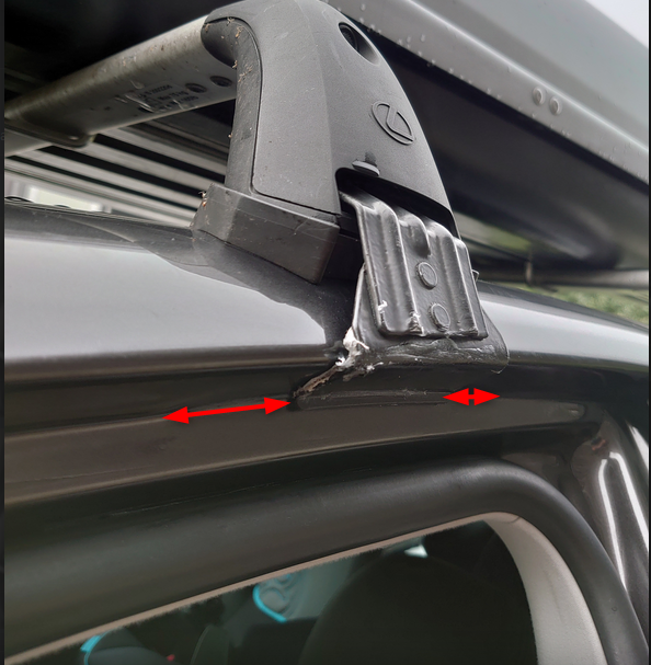 Nu valt mij op dat steeds als het regent, er regenwater tussen het portier en het dak begint door te druppelen, op de plaats waar de dakdragers zich om het dak heen klemmen.