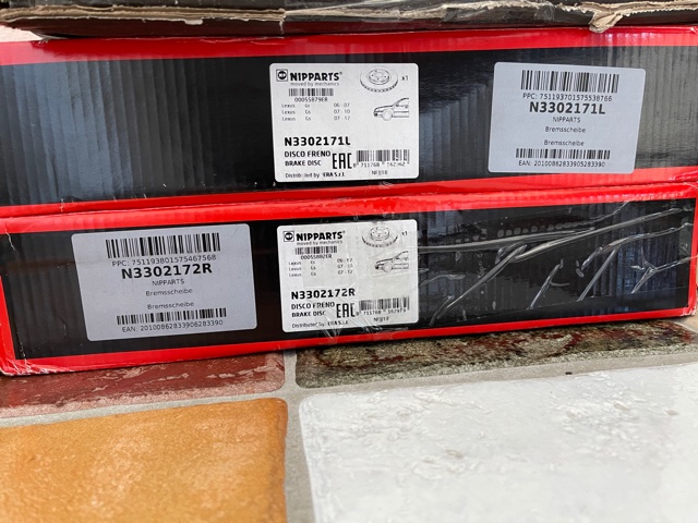 Gaat om schijven van het merk Nipparts, N3302172R & N3302171L. Zijn Links en rechts apart i.v.m. de plaatsing van de koel-dingetjes in de schijf. Ze mogen voor 6 tientjes weg, bijna 100 euro bij autodoc.nl en in NL duurder.