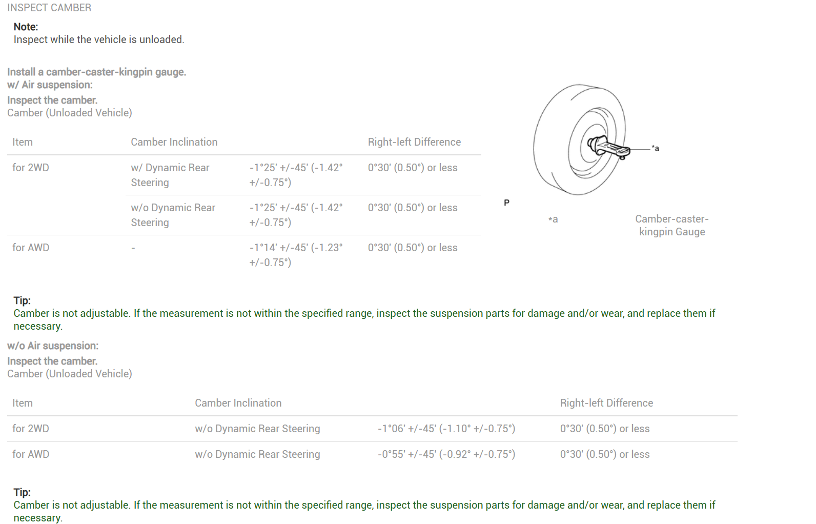 Achteraan beginnen (camber is veelal niet stelbaar op de achteras) en dan naar voren.
