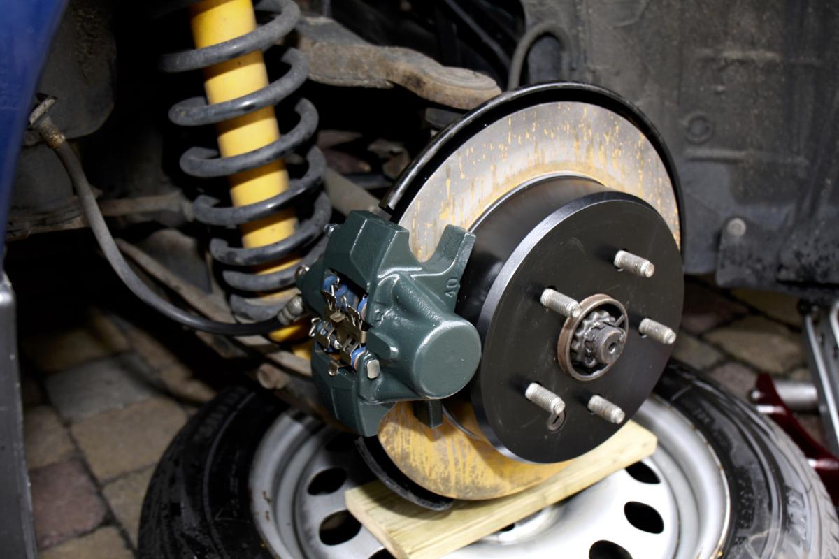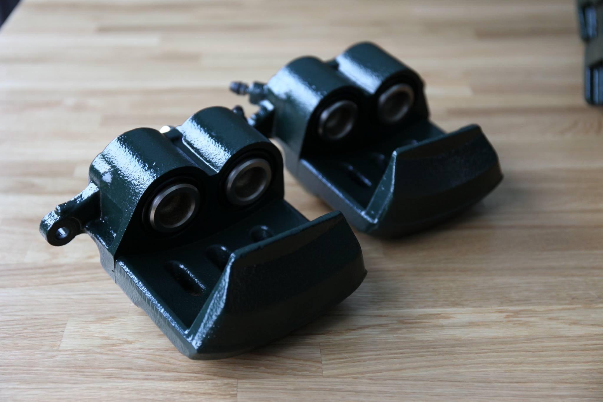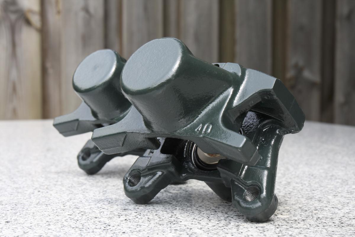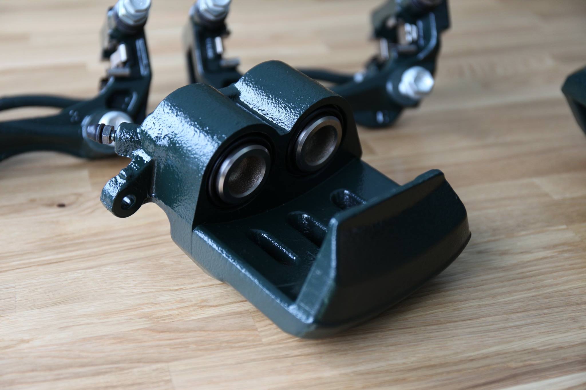 Hammerite standgroen hoogglans (spuitbus 400ml). Remschijf is voorzien van Hammerite zwart mat (spuitbus 400ml). Komt aardig dicht bij de originele kleur.