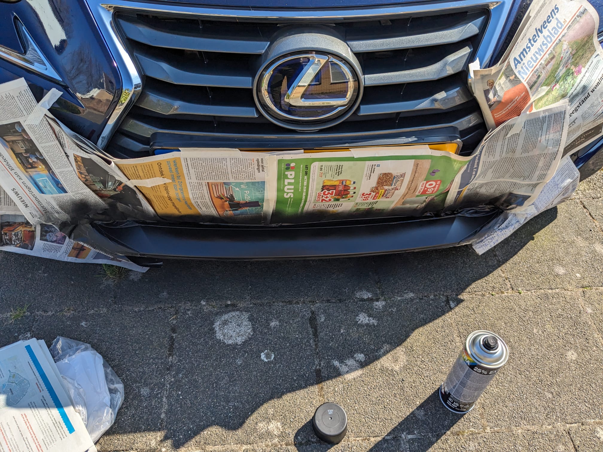 Meteen overspuiten vond ik net iets teveel toewijding, maar gelukkig heb je tegenwoordig plastidip. Dit kan je er makkelijk weer afhalen mocht het je toch niet bevallen, dus ik heb precies dat gebruikt. Even alles afgeplakt, de onderkant ontvet en daarna 5 lagen plastidip gedaan op de onderbumper: